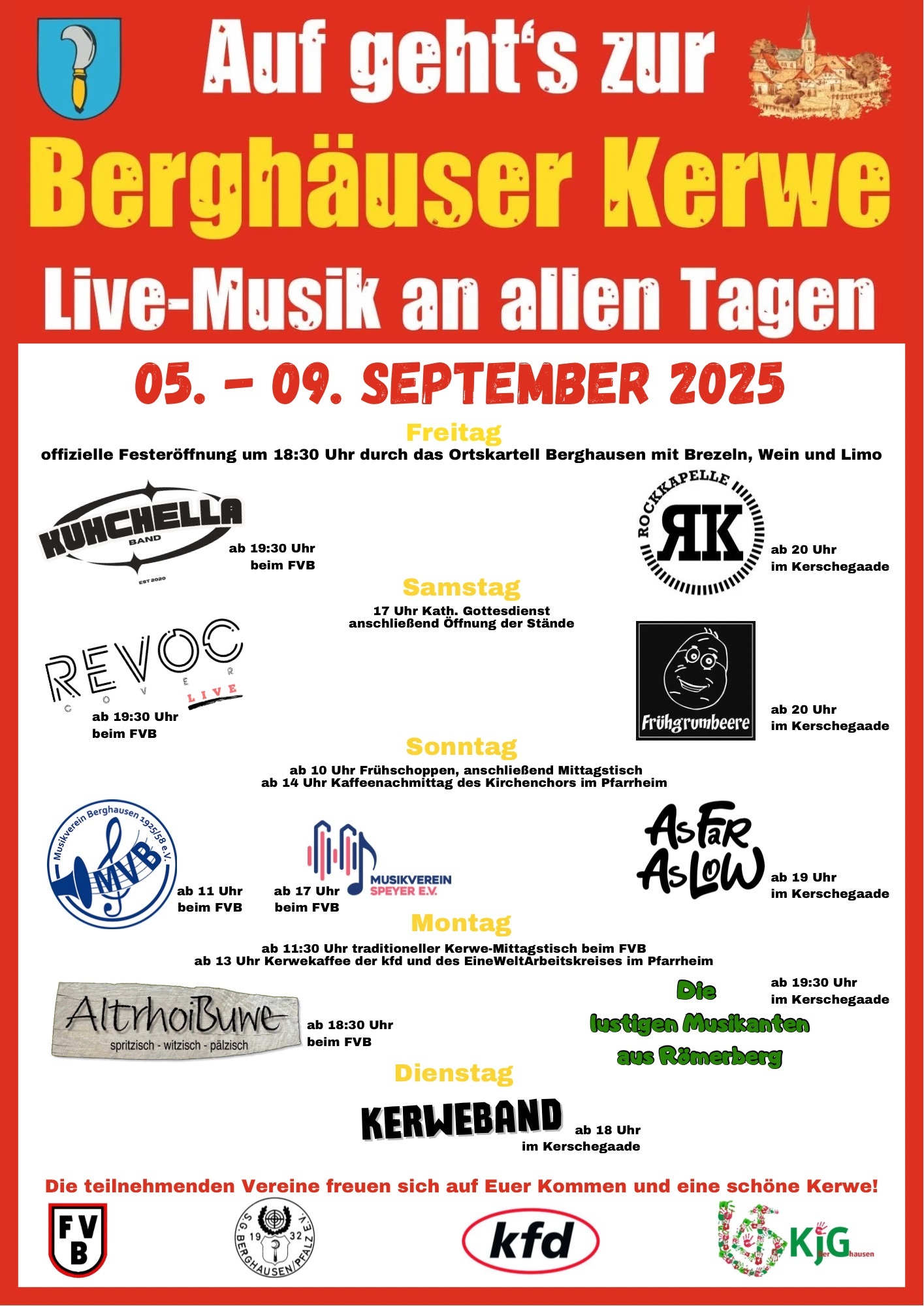Die Berghäuser Kerwe findet immer am 1. Wochenende im September statt. Hier erhalten Sie alle Informationen über das Programm und die Angebote der Vereine der diesjährigen Kerwe.